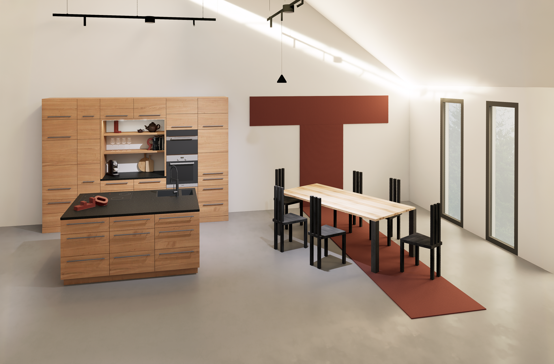 Die Wohnraumgestaltung lebt von Kontrasten und Präzision: Schwarze Stühle in filigraner Lamellen-Konstruktion setzen ein grafisches Statement und umrahmen einen massiven Tisch, der Stabilität und Wertigkeit ausstrahlt. Herzstück des Raums ist eine individuell geplante Küche aus massivem Kirschholz. Die natürliche Struktur des Holzes bleibt sichtbar und bringt Wärme in das moderne Raumkonzept. Eine hell- bis mittelgraue Tür aus Tanne/Fichte ergänzt die Gestaltung, verbindet funktionale Schlichtheit und fügt sich harmonisch ins Gesamtbild ein. Holz-Metall-Fenster sorgen zusätzlich für lichtdurchflutete Räume und schaffen eine offene Verbindung nach aussen.